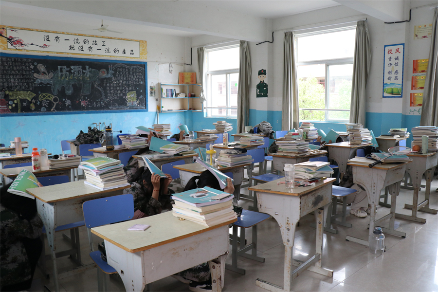 在各班授课教师的组织引导下,所有学生双手交叉,用书本护住头部,按照设定的逃生路线,快速、有序撤离到学校操场上。