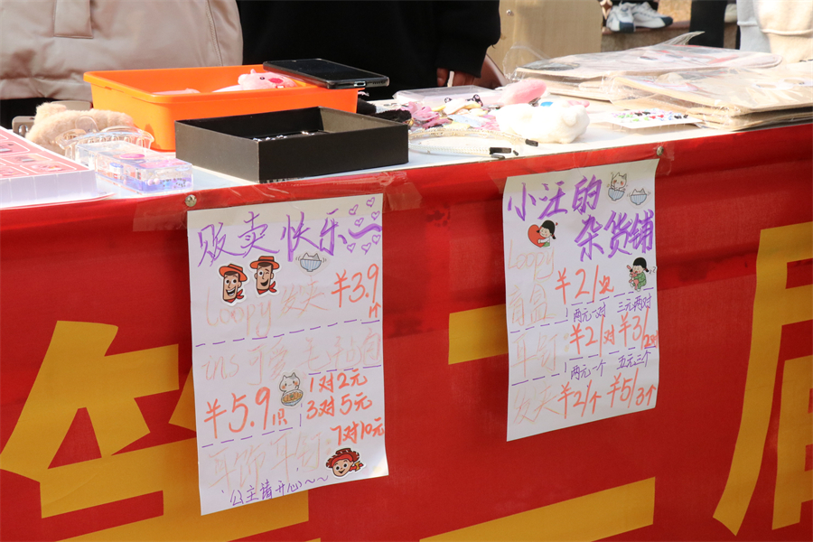 看,活动现场人头攒动,熙熙攘攘,叫卖声,欢笑声不绝于耳。各展位上的商品丰富多样、琳琅满目——生活用品、自制手工品、美术手工文具、二手文创用品等。各个“小老板”们施展“绝招”,招揽顾客。同学们驻足观看、争相“淘宝”。整个过程热闹非凡而又秩序井然。