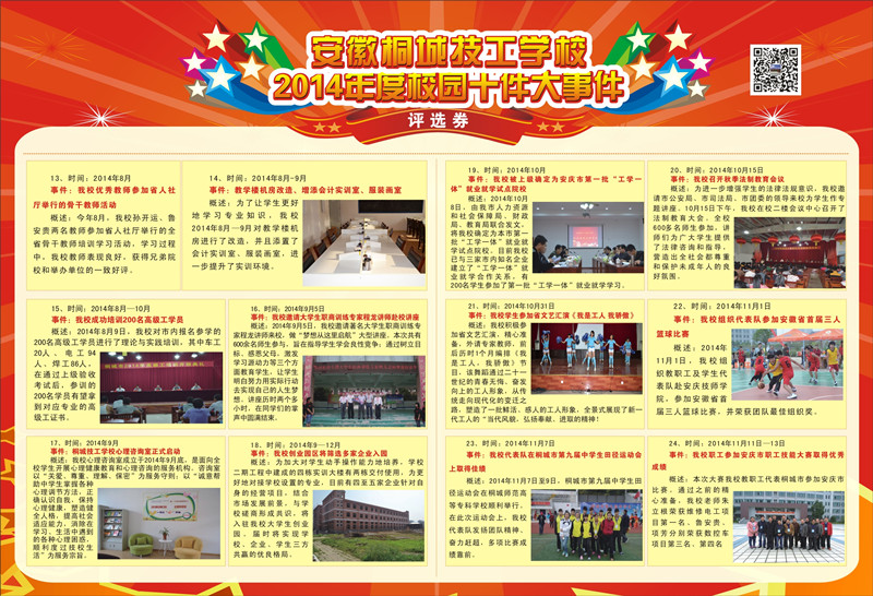 通告:安徽桐城技工学校《2014年度校园十件大事评选活动》正式开始啦!大家可以图片内容中的24件当年校园事件中评选出你心中的十件校园大事。最终结果会在我校2015年元旦晚会公布,欢迎大家积极留言,参与活动。