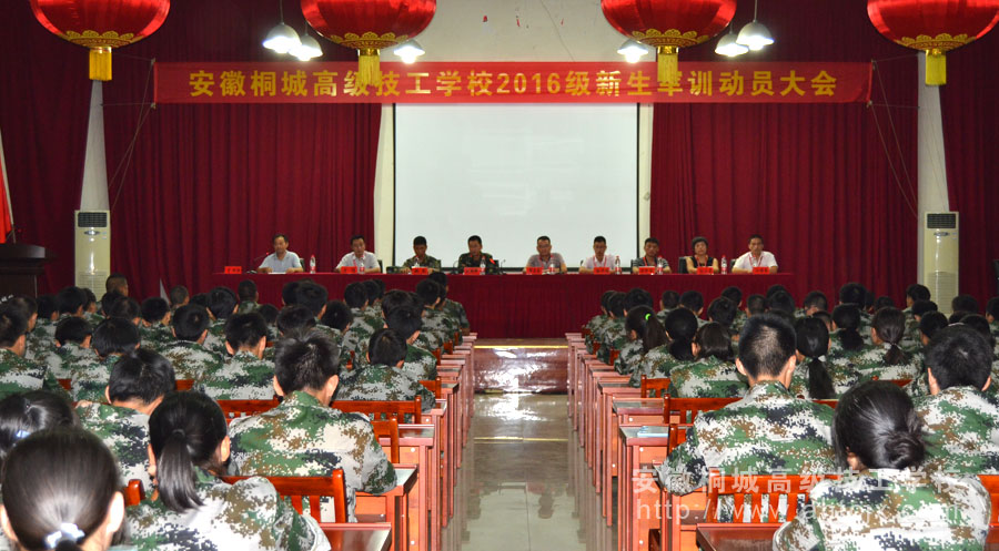 8月21日上午,安徽桐城高级技工学校隆重举行2016级新生军训动员大会,拉开了军训的序幕。市委常委市人武部政委刘朝辉亲自出席动员会、桐城高级技工学校郭校长、军训带队教官钱队长、校各部门领导、全体教职工、2016级新生参加此次动员大会。会议由校长助理李期胜主持。