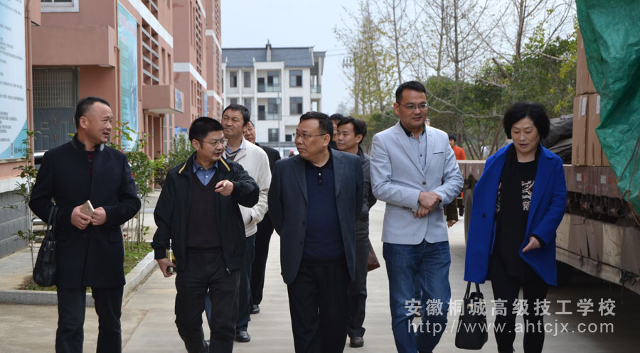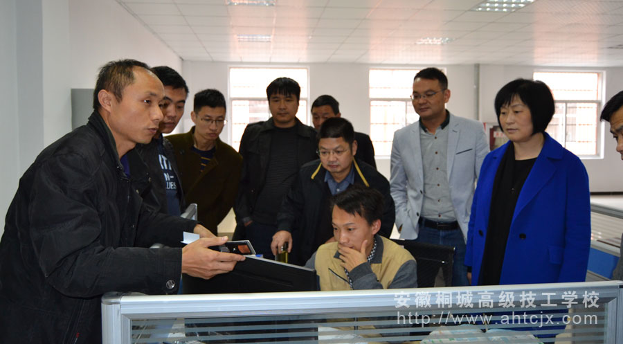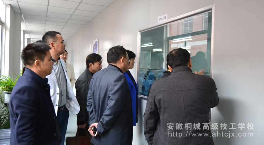 2016年11月8日下午,安庆市教育体育局副局长周泉一行来校就桐城高级技工学校二期校企合作工作开展情况进行调研,桐城市副市长马玉荣、教育局局长金锰、桐城高级技工学校校长郭昌盛陪同参观调研。