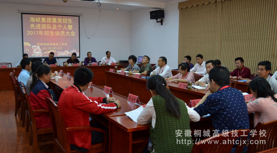 2017年5月12日下午,海峡集团公司、安徽桐城高级技工学校,在学校二楼会议室,召开海峡集团公司嘉奖招生先进个人暨2017年秋季招生动员大会,市人社局党组成员姚笃超,安徽海峡集团董事长郭黄胜,安徽桐城高级技工学校校长郭昌盛,校全体教职员工参加会议。会议由方正明同志主持。