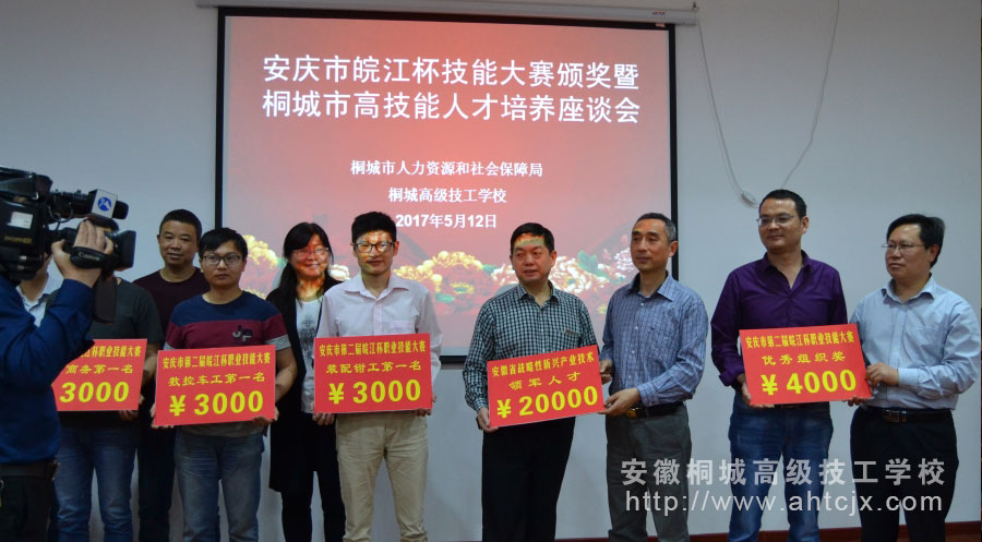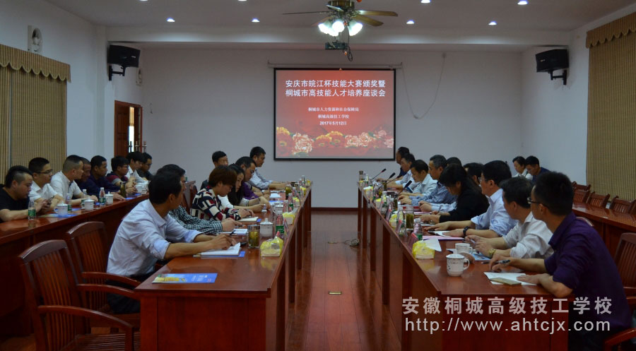 2017年5月12日上午,桐城市人力资源和社会保障局在桐城高级技工学校二楼会议室召开安庆市皖江杯技能大赛颁奖暨桐城市高技能人才培养座谈会,桐城市委组织部副部长、市人社局局长吴绳武,副局长赵决智、孙朝阳,纪检组长胡向红,市人社局党组成员姚笃超,市就业局局长周朝进,安徽海峡集团董事长郭黄胜,安徽桐城高级技工学校校长郭昌盛,参加会议。