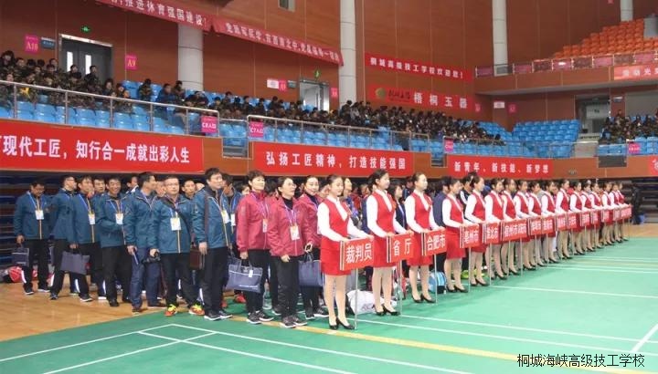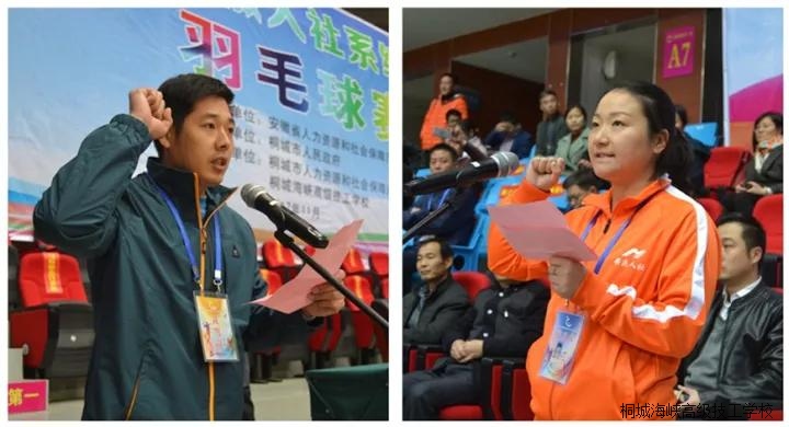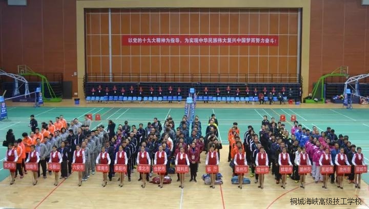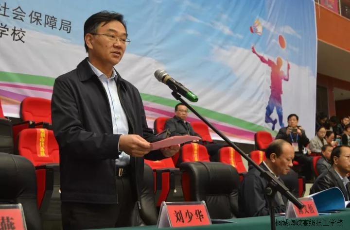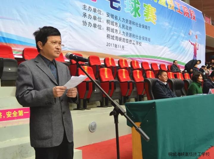 开幕式由陈义梧主持,开幕式在雄壮的国歌声中拉开帷幕,伴随着运动员进行曲,来自省人社厅及16个地市技工院校共17支代表队200余名运动员、裁判员依次入场。开幕式上,江学潮副市长代表桐城市委市政府作了热情洋溢的致词。刘少华副厅长代表省人社厅发表讲话并宣布比赛开始。他在讲话中感谢桐城市委市政府对本次羽毛球大赛给予的大力支持,高度肯定了桐城市人社局、桐城海峡高级技工学校对这次竞赛活动所作的精心组织和周到安排,刘少华勉励全体运动员在接下来的比赛中赛出水平、赛出风格、赛出友谊,希望各代表队通过本次竞赛活动,加强交流、增进感情、推动工作。