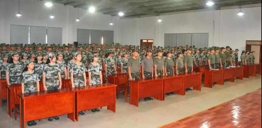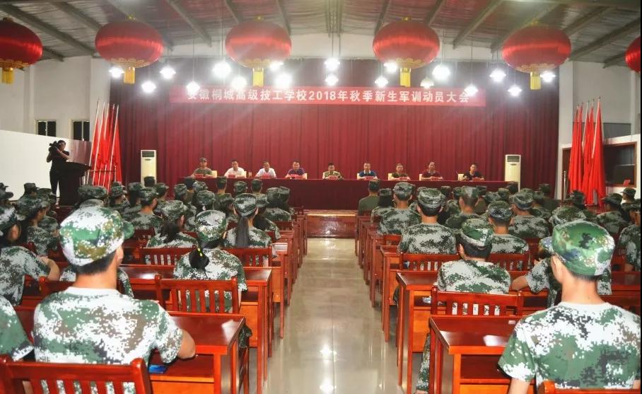 2018年8月19日上午8:30分,安徽桐城高级技工学校2018新生军训动员大会在学校大礼堂隆重举行。来自桐城高级技工学校电子商务专业、高铁乘务专业、智能机器人专业、新能源汽车专业、学前教育专业、影视传媒专业及银行定单班400多名新生,身着迷彩军装,装容整齐,斗志昂扬参加军训动员大会。