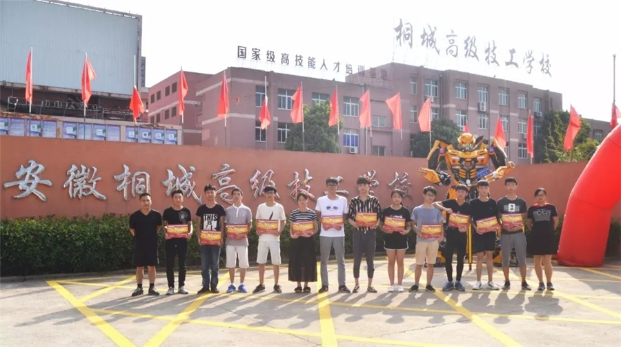 6月6日,桐城高级技工学校全体师生为15级高考生隆重送考。