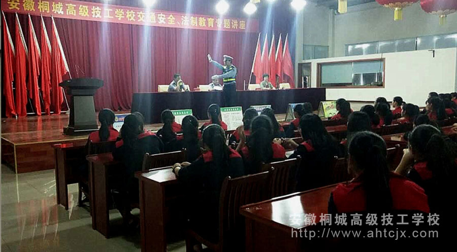 2017年5月5日下午两点,安徽桐城高级技工学校邀请市公安局交警大队,司法局到校开展交通安全、法制教育专题讲座,受到全校师生的欢迎。在大会上,主讲干警向师生们宣讲了交通规则常识、校园安全法律法规、消防安全、食品卫生安全、预防自然灾害、预防暴力侵害、网络安全、课间活动安全、未成年人保护法等相关知识。让师生们观看展板以此来了解安全的重要性。通过此次宣传教育活动,进一步增强了学生的安全意识,有效提升他们的安全防范技巧,让同学们充分认识到遵守交通规则的重要性,有效增强了自我救护意识。提高了救护逃生能力,对防范校园安全事故的