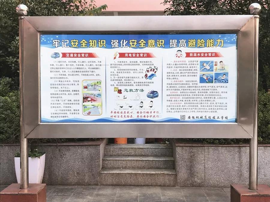 桐城高级技工学校为强化安全意识,平时充分利用学校宣传栏、班级黑板报进行安全知识的宣传,并对日常校园安全设备定期检查。